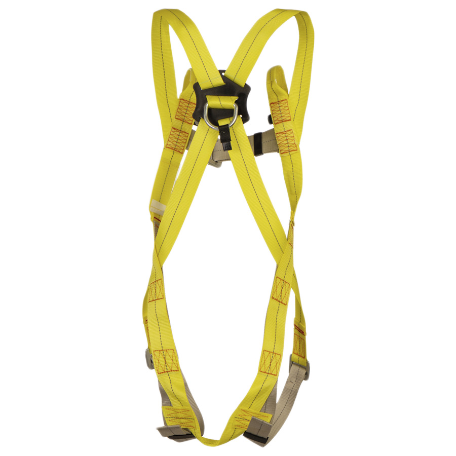 Страховочная точка крепления расположена на спине. Ее можно передвигать по вертикали на Х-образных плечевых лямках для корректировки правильного положения под рост пользователя.