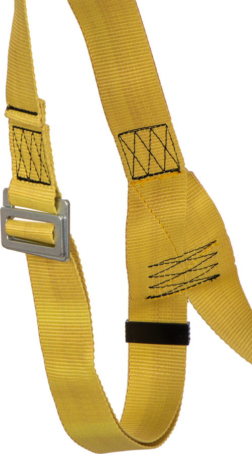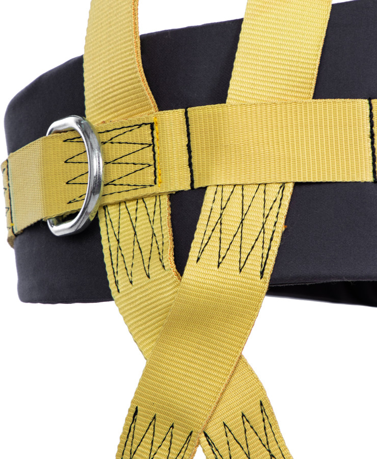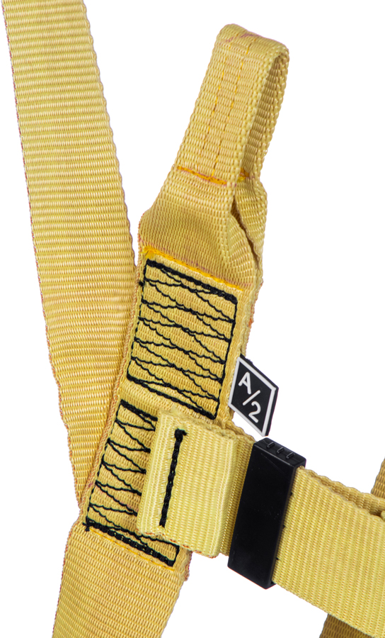 Страховочная точка, расположенная на спине, передвигается под рост пользователя. Ее можно смещать по вертикали на Х-образных плечевых лямках для корректировки правильного положения.