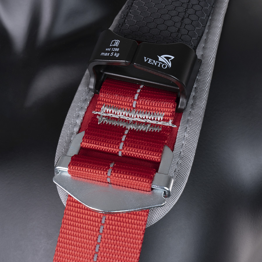 Привязь снабжена индикаторами рывка. Конструкция привязи обеспечивает максимальное распределение нагрузки на пояс, ножные ленты и плечевые лямки в момент остановки падения. Широкий термоформованный кушак и накладки на плечевых и ножных обхватах снабжены трикотажной тканью с внутренней стороны для более комфортного нахождения в привязи