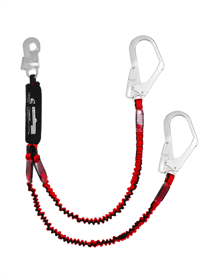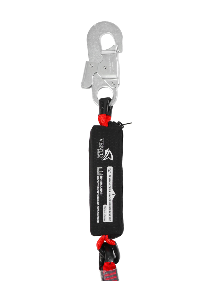 Эластичная лента укорачивает строп при отсутствии действия силы, внешняя трубчатая лента принимает на себя основную нагрузку в момент остановки падения.