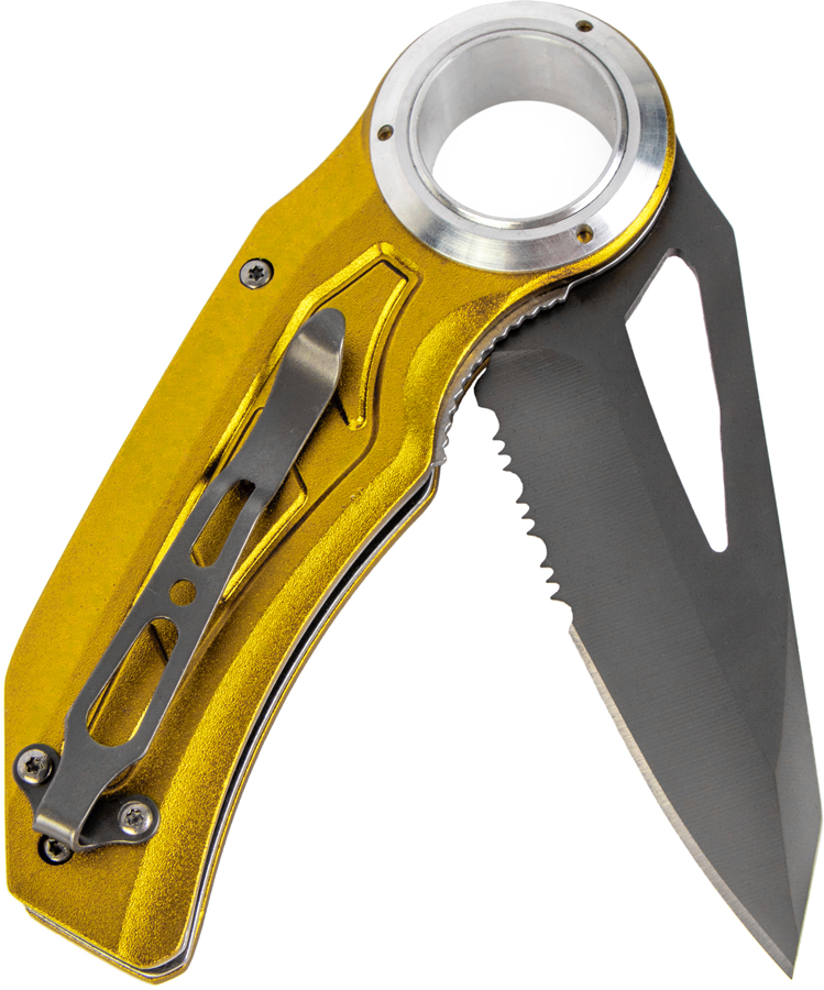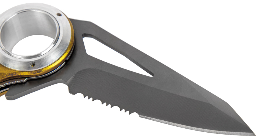 Складной нож с комбинированным (гладким и зубчатым) лезвием для перерезания веревки или репшнура.